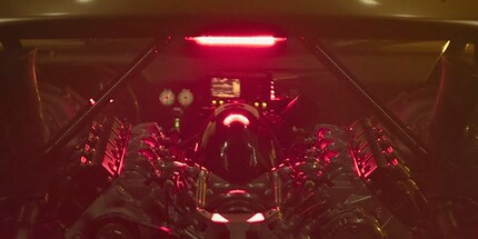 The V8 in the boot appears to be powered by some kind of jet engine. Or it has the biggest, loudest exhaust in the universe. The picture provides a view of the Cockpit. A touchscreen is installed in the centre.